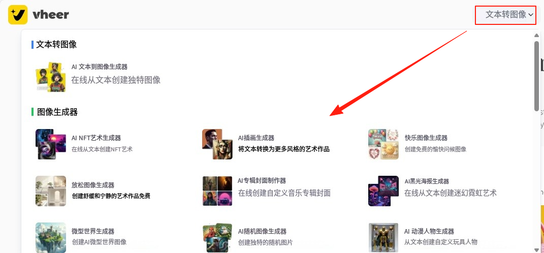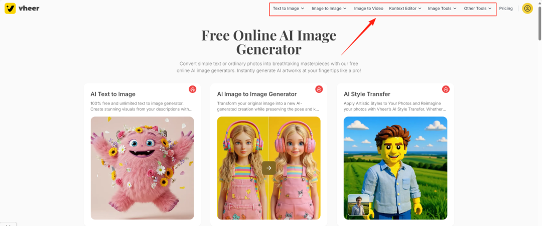 打开vheer,主页面最上方有一个工具栏,文生图到图生图、图生视频、图像编辑等各式各样的功能一应俱全。