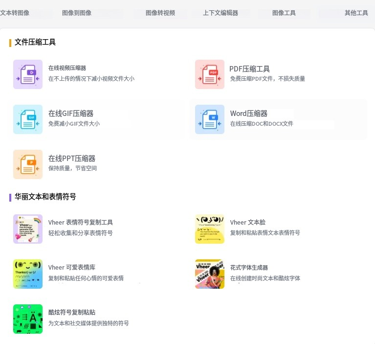 Vheer的功能还非常多,比如各种办公软件压缩工具、一键抠图、花式字体、表情包工具等等。