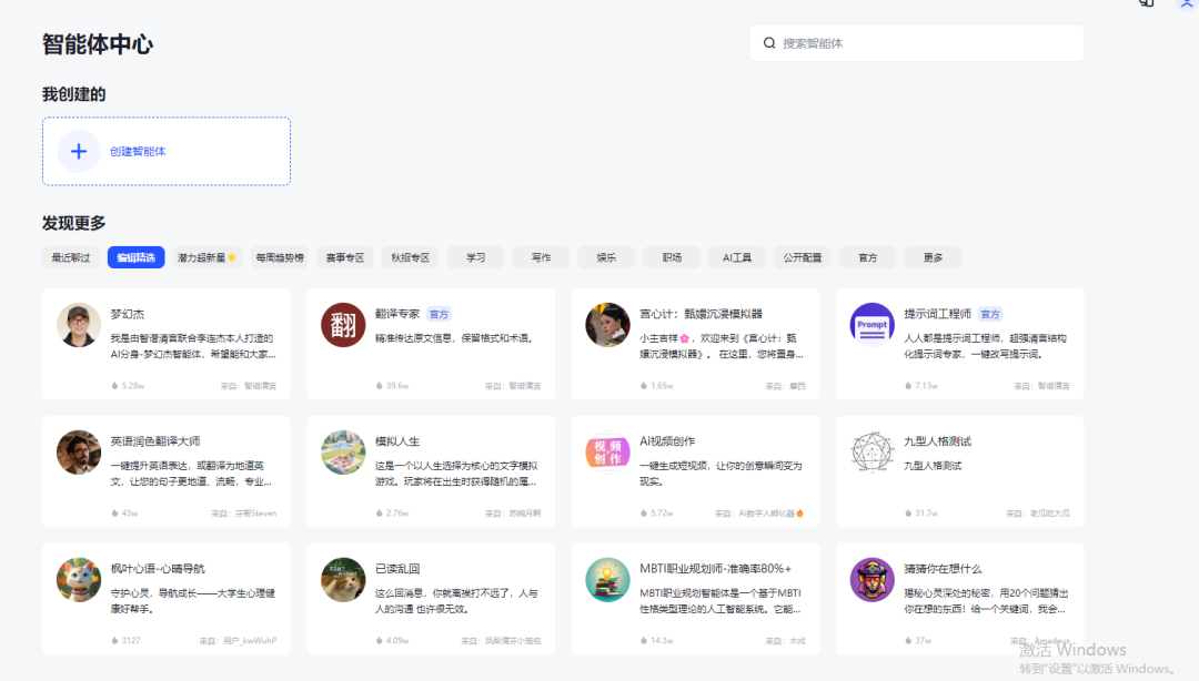 除了常用的AI对话,AI生图、AI视频以外,智能体中心还有丰富的智能体模板,几乎涵盖了AI应用的各行各业。