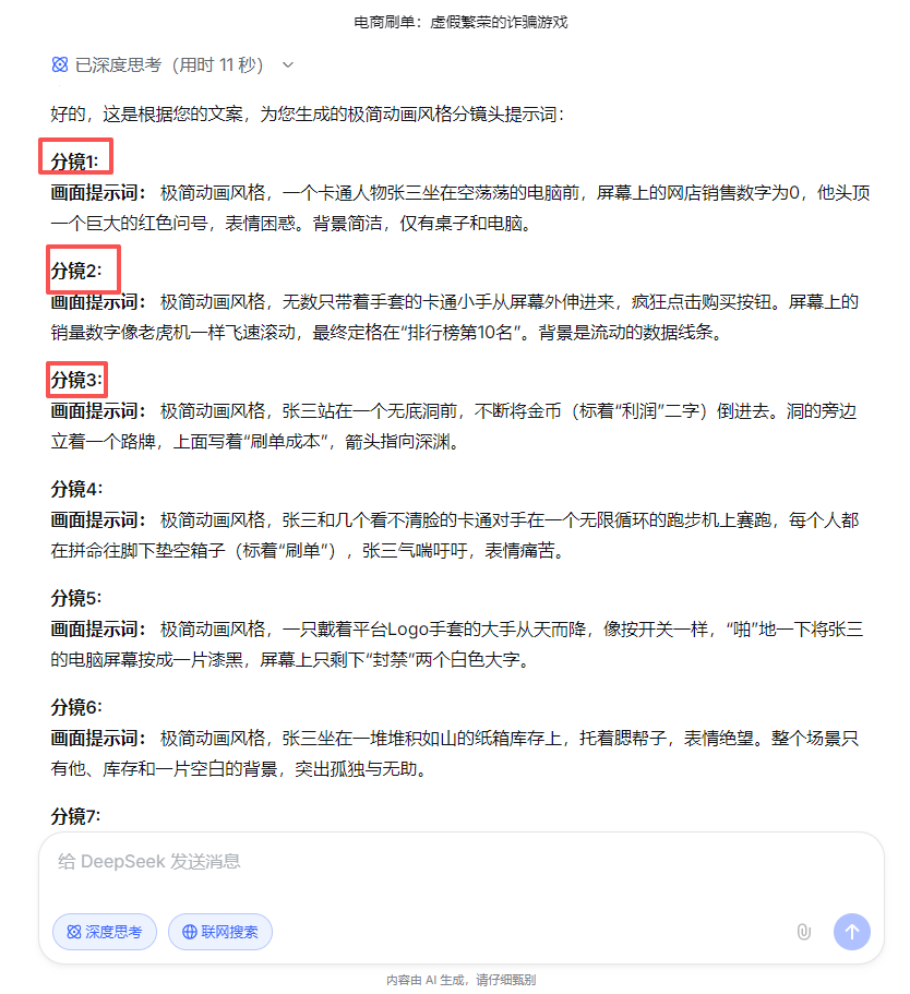 利用豆包AI免费且能高效批量出图功能,将DeepSeek生成的分镜头脚本,复制到豆包AI一键批量出图。