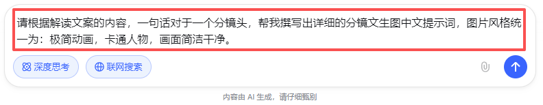 请根据解读文案的内容,一句话对于一个分镜头,帮我撰写出详细的分镜文生图中文提示词,图片风格统一为:极简动画,卡通人物,画面简洁干净。