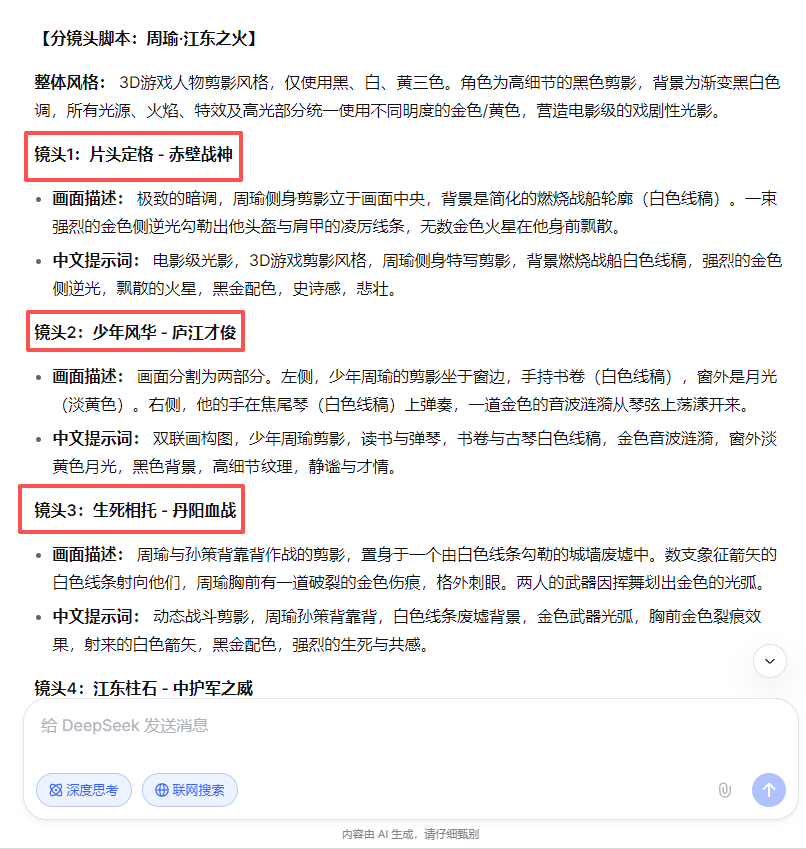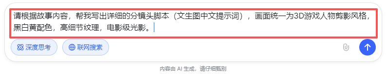 请根据故事内容,帮我写出详细的分镜头脚本(文生图中文提示词),画面统一为3D游戏人物剪影风格,黑白黄配色,高细节纹理,电影级光影。
