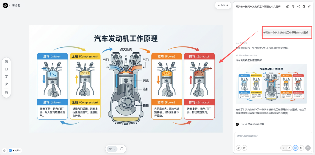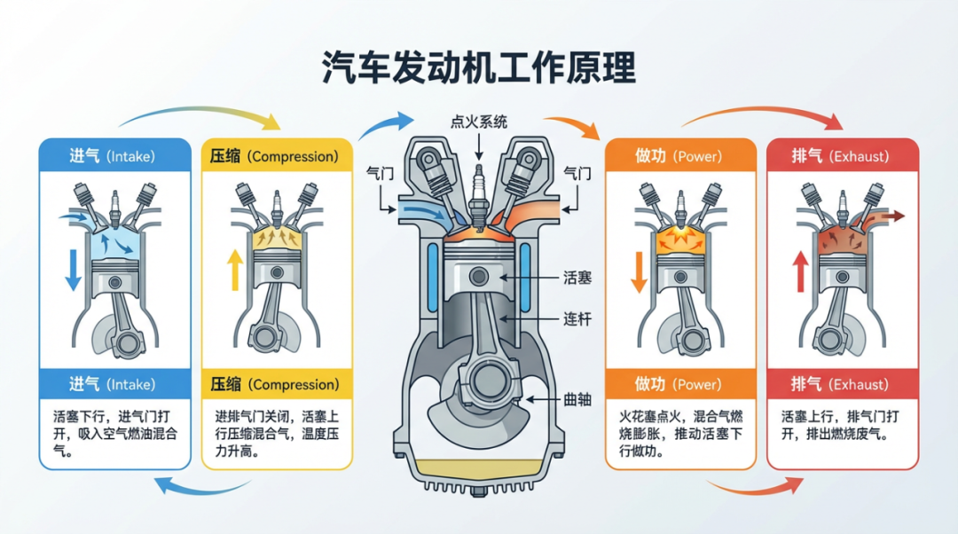 提示词:帮我做一张汽车发动机工作原理的中文图解。