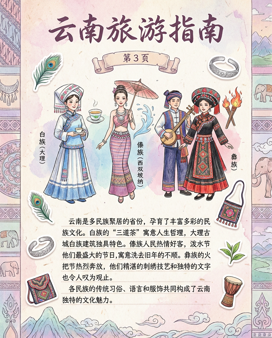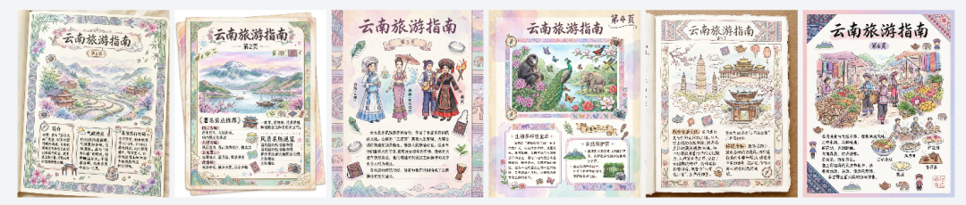提示词:生成十张连续的云南的旅游指南,要求手账形式,画面要纯中文,非常精美