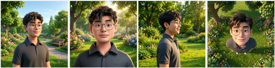 提示词:请将图中的人物放到公园里,并输出不同的角度拍摄系列图