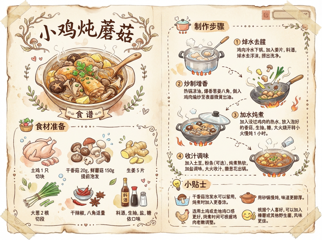 提示词:以手账的形式制作一个“小鸡炖蘑菇”的食谱图
