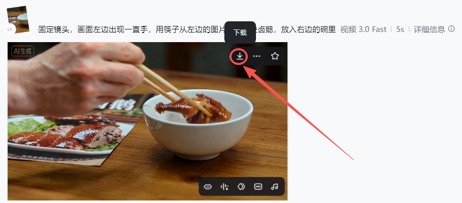 固定镜头,画面左边出现一只手,用筷子从左边的图片中夹一块卤鹅,放入右边的碗里