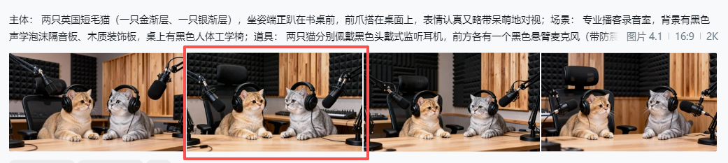主体: 两只英国短毛猫(一只金渐层、一只银渐层),坐姿端正趴在书桌前,前爪搭在桌面上,表情认真又略带呆萌地对视;场景: 专业播客录音室,背景有黑色声学泡沫隔音板、木质装饰板,桌上有黑色人体工学椅;道具: 两只猫分别佩戴黑色头戴式监听耳机,前方各有一个黑色悬臂麦克风(带防震架);风格: 超写实摄影,高清细节,柔和灯光,温暖色调,可爱治愈氛围,8K 分辨率