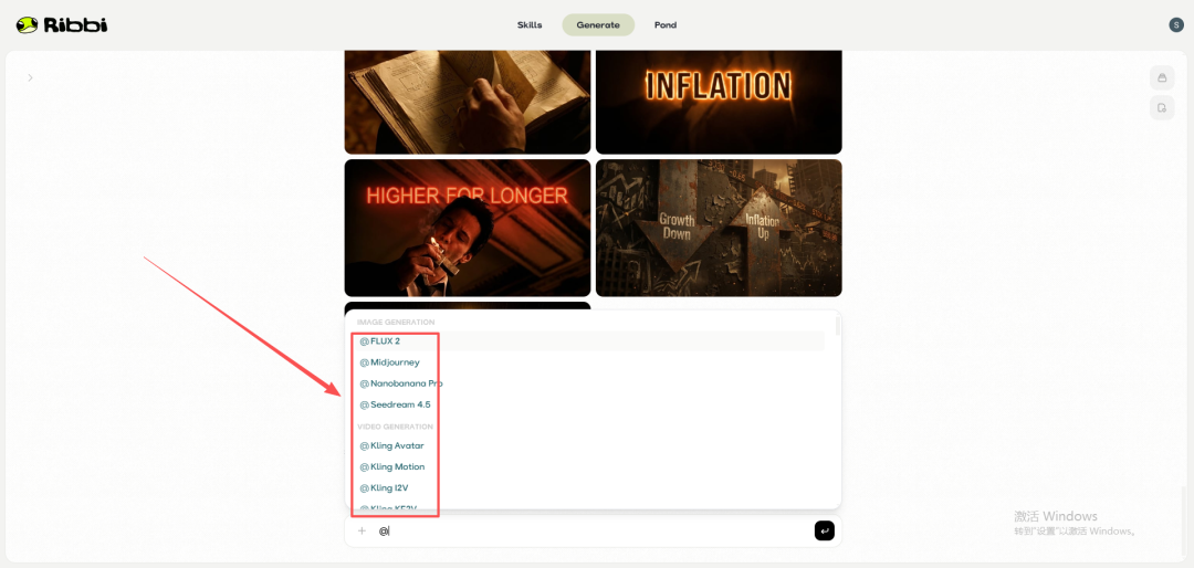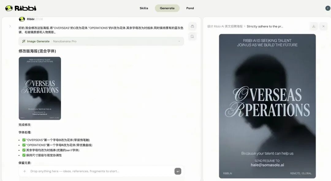 Ribbi内置了一百多个tool call自由组合,涵盖了从灵感设计到文本创作、图片、配音、视频、剪辑等所有与创意相关的生产闭环。