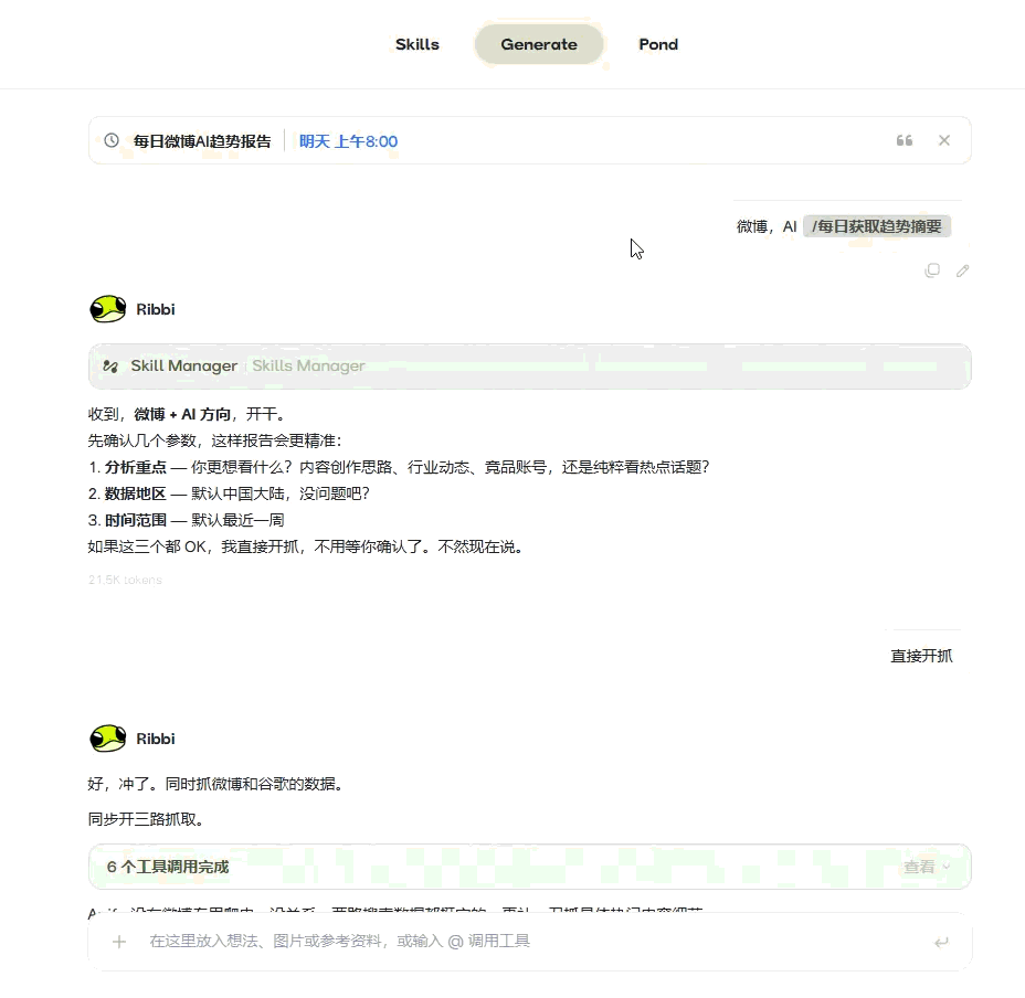 在以上所有的内容创作中,Ribbi会主动去思考创意,并调用不同的工具组合,来进行每个环节的创作。